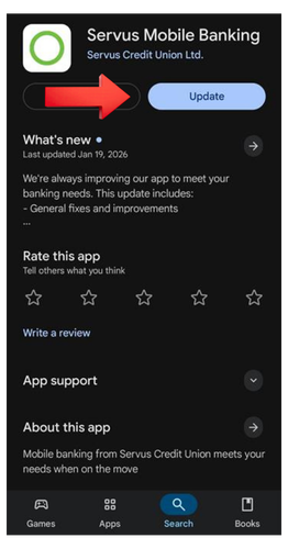 Members may be experiencing an error when trying to access Mobile Banking through the Servus app.